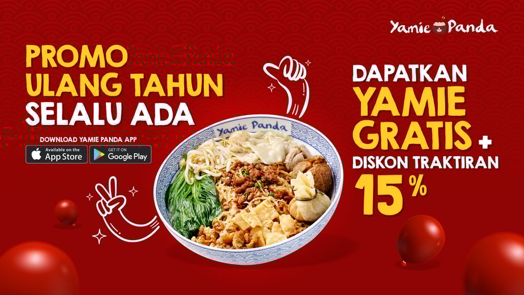 Saat berulang tahun, Bestie Yamie pelanggan loyal kami yang memiliki aplikasi Yamie Panda akan mendapatkan hadiah istimewa berupa 1 voucher kado ultah untuk klaim semangkuk yamie gratis dan 1 voucher diskon traktir temen untuk traktir temen, gebetan, saudara atau siapapun.