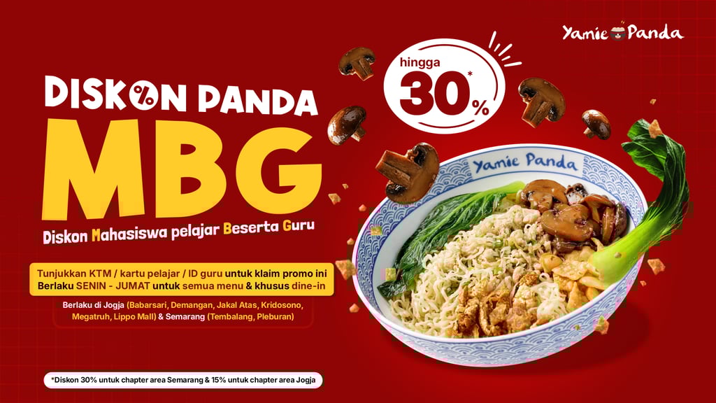 Diskon khusus untuk mahasiswa, pelajar dan guru sekolah formal untuk pemesanan dine-in semua menu Yamie Panda tiap Senin hingga Jumat.