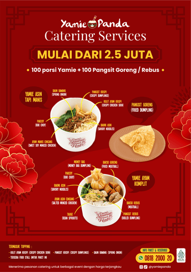 Yamie Panda memiliki layanan katering dengan pilihan paket menu yang bisa dinikmati bersama untuk meramaikan berbagai momen spesial Anda, seperti pernikahan, ulang tahun, acara kantor, acara sekolah, kompetisi olahraga hingga kumpul keluarga.