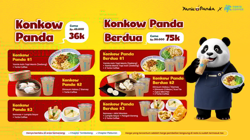 Semangkuk yamie hangat dan ngenyangin berpadu dengan segelas kopi dingin yang nenangin kini bisa kamu nikmati di Yamie Panda Area Semarang.