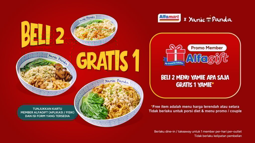 Gratis 1 porsi yamie dengan pembelian 2 porsi menu yamie apa saja khusus member Alfagift.