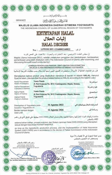 Kami percaya, makan enak itu harus dibarengi rasa nyaman. Makanya, di setiap chapter Yamie Panda, Anda nggak cuma menikmati mie favoritmu, tapi juga ketenangan karena semua yang Anda santap sudah terjamin kehalalannya, ditambah dengan standar kualitas dan keamanan yang kami jaga dengan sepenuh hati.