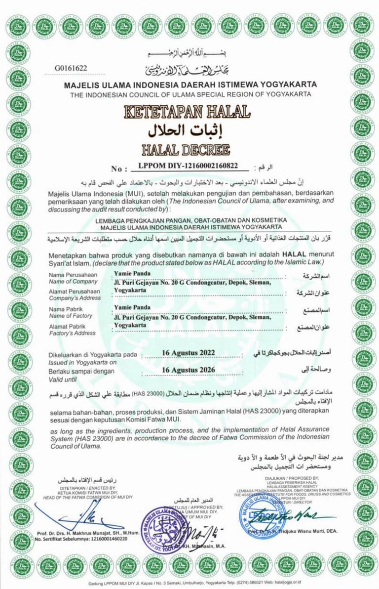 Sejak tahun 2014, Yamie Panda sudah mengantongi Sertifikat Halal dari LPPOM MUI. Bukan cuma sekali, tapi terus kami perpanjang secara berkala sebagai bentuk komitmen kami untuk selalu menjaga kehalalan setiap hidangan yang kami sajikan.